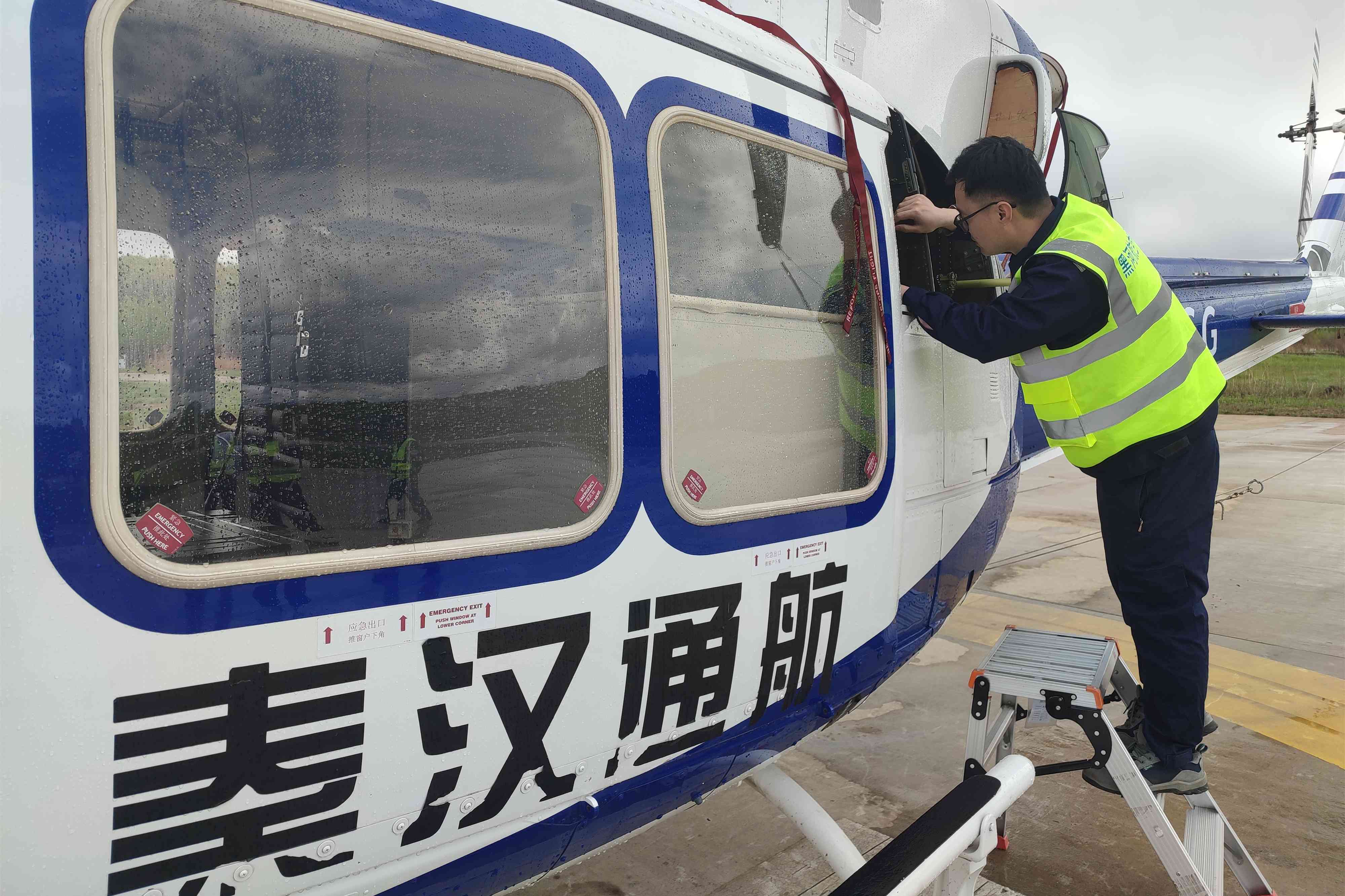 4月12日破晓,,,,,,,,嫩江突然飘起雪花,,,,,,,,并逐步转化成冰粒。。。。。。。已经入睡的作业队成员发明天气转变后,,,,,,,,连忙冒着风雪奔向外场停唬唬;;;;;,,,,,,,,对直升机举行外部防护的同时,,,,,,,,并开展了检查事情,,,,,,,,确保直升机不受损伤。。。。。。。